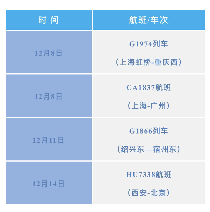搭乘過(guò)以下交通工具的來(lái)(返)川人員,第一時(shí)間主動(dòng)向社區(qū)或居(村)委會(huì)、單位或入住酒店報(bào)備旅居史,配合做好相關(guān)防控工作。