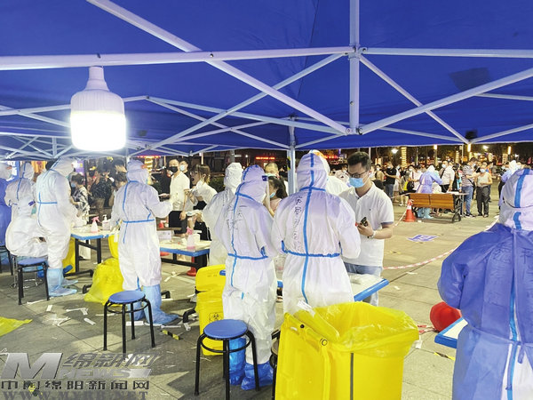 “我是一名黨員,更是一名疾控人,我申請到駐點最近的地方開展防疫工作。”剛從昭覺回來的疾控人員陶文第,主動來到隔離點駐點防疫……像陶文第這樣主動請纓、義無反顧沖向疫情防控一線的醫(yī)護工作者有很多:露天廣場上,巨大的藍色遮陽棚內(nèi),來自市中心醫(yī)院、三醫(yī)院、人民醫(yī)院、婦幼保健院及腫瘤醫(yī)院的醫(yī)護人員專注地忙碌著;全市醫(yī)療系統(tǒng)包括江油、平武、北川等醫(yī)院醫(yī)務人員迅速支援,在涪城、游仙開啟兩輪大規(guī)模核酸采樣。持續(xù)的高溫下,醫(yī)護人員在兩輪檢測中,整日包裹在密不透風的防護服里,一干就是好幾個小時,她們克服了汗如雨下的困境和呼吸困難、無法喝水、上廁所等“麻煩”,堅守在核酸檢測一線,摘下口罩,滿臉壓痕,脫下手套,雙手已被汗水浸得發(fā)白,防護服下的衣服全部濕透……