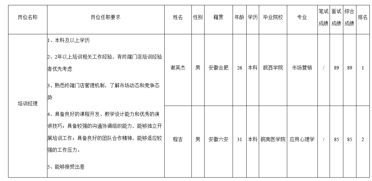根據(jù)合肥長虹美菱生活電器有限公司發(fā)布的招聘公告及招聘相關規(guī)定,經(jīng)面試等程序,現(xiàn)將成績予以公示。