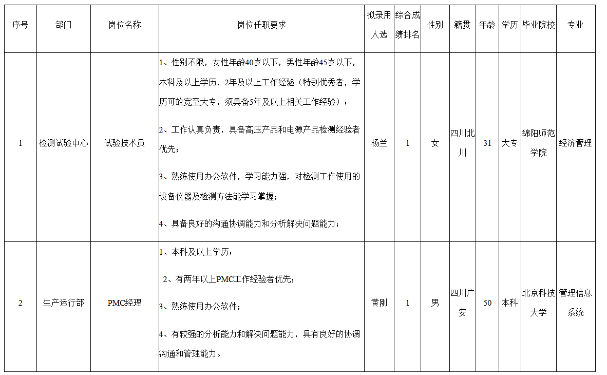 根據(jù)四川長(zhǎng)虹電源股份有限公司發(fā)布的招聘公告及招聘相關(guān)規(guī)定,經(jīng)筆試、面試、考察、體檢等程序,擬錄用黃剛、楊蘭2名同志到我司工作,現(xiàn)予以公示,具體情況如下: