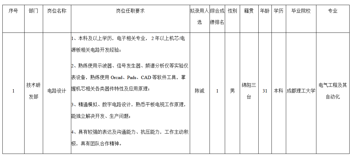 根據(jù)四川長虹電器股份有限公司(多媒體公司)發(fā)布的招聘公告及招聘相關(guān)規(guī)定,經(jīng)面試、考察、體檢等程序,擬錄用陳誠同志到技術(shù)研發(fā)部工作,現(xiàn)予以公示,具體情況如下:
