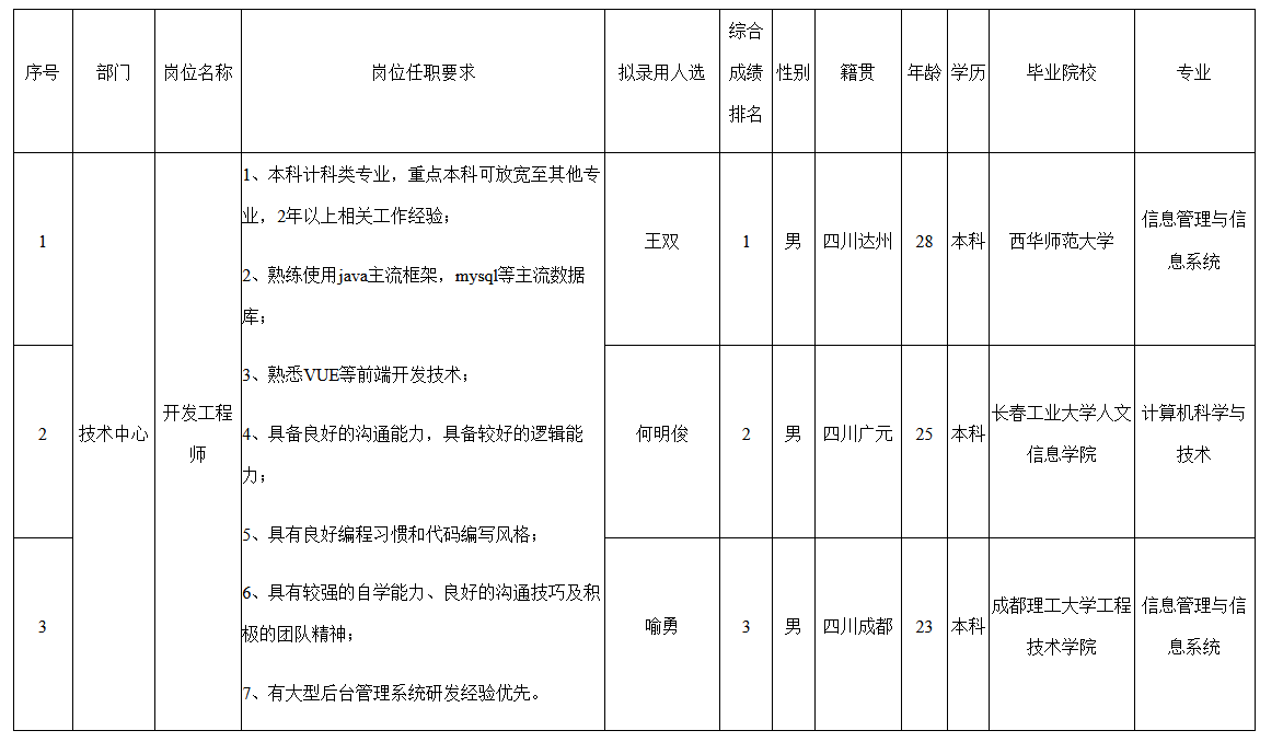根據(jù)成都九州電子信息系統(tǒng)股份有限公司發(fā)布的招聘公告及招聘相關(guān)規(guī)定,經(jīng)筆試、面試、考察等程序,擬錄用王雙等同志到成都九州電子信息系統(tǒng)股份有限公司工作,現(xiàn)予以公示,具體情況如下: