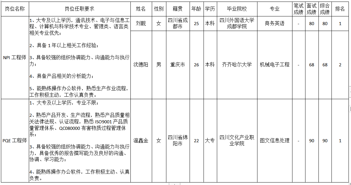 根據(jù)四川九州電子科技股份有限公司發(fā)布的招聘公告及招聘相關(guān)規(guī)定,經(jīng)筆試、面試等程序,現(xiàn)將筆試(面試)成績(jī)予以公示。