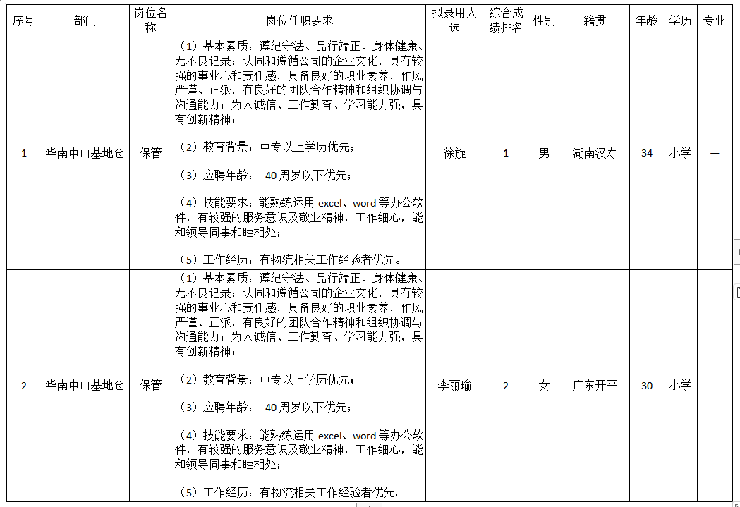 根據(jù)四川長虹民生物流股份有限公司發(fā)布的招聘公告及招聘相關(guān)規(guī)定,經(jīng)面試、體檢等程序,擬錄用徐旋等2名同志到四川長虹民生物流股份有限公司工作,現(xiàn)予以公示,具體情況如下: