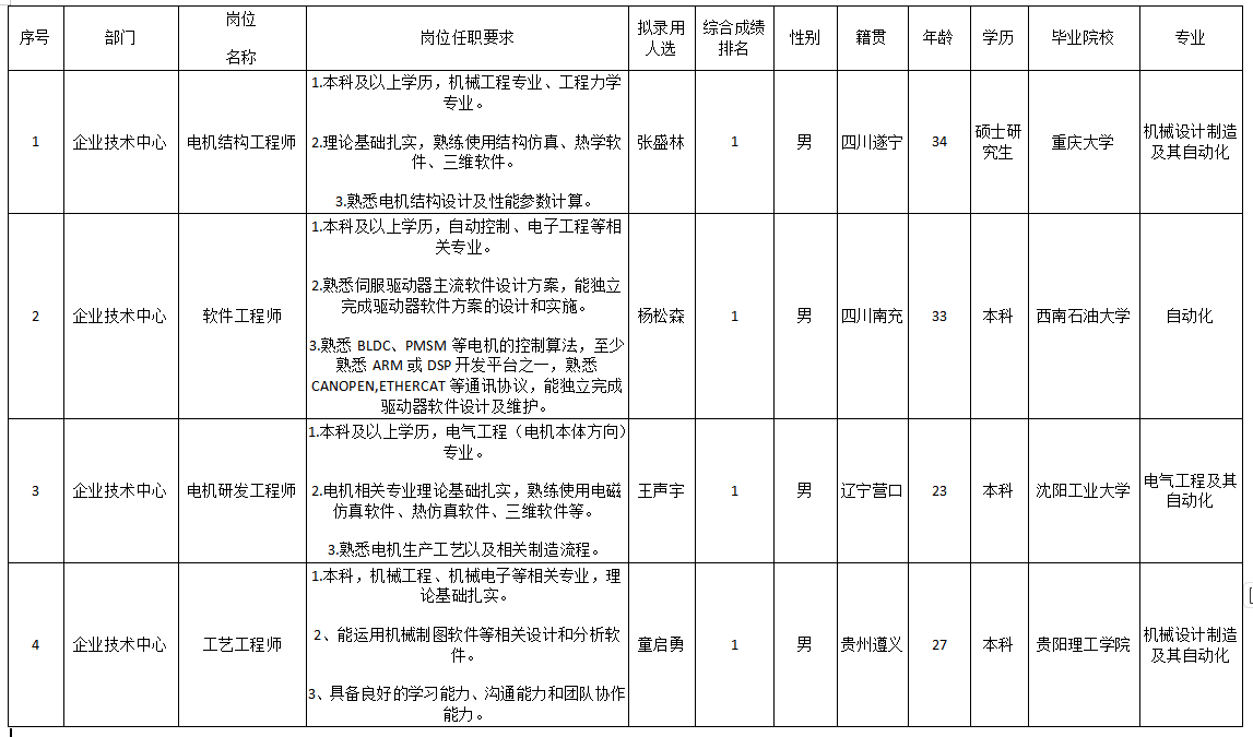 根據(jù)成都微精電機(jī)股份公司發(fā)布的招聘公告及招聘相關(guān)規(guī)定,經(jīng)面試、考察、體檢等程序,擬錄用張盛林等4名同志到成都微精電機(jī)股份公司工作,現(xiàn)予以公示,具體情況如下: