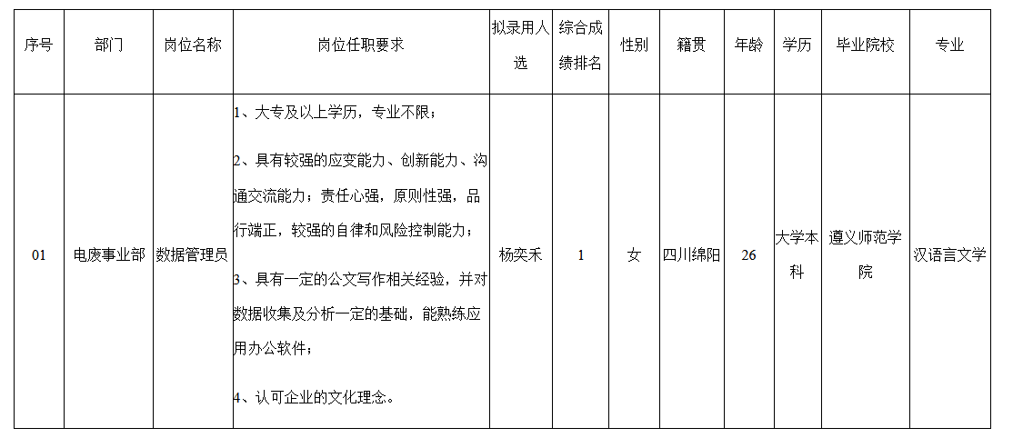 根據(jù)長(zhǎng)虹格潤(rùn)公司發(fā)布的招聘公告及招聘相關(guān)規(guī)定,經(jīng)面試、背景調(diào)查、體檢等程序,擬錄用楊奕禾同志到長(zhǎng)虹格潤(rùn)公司工作,現(xiàn)予以公示,具體情況如下: