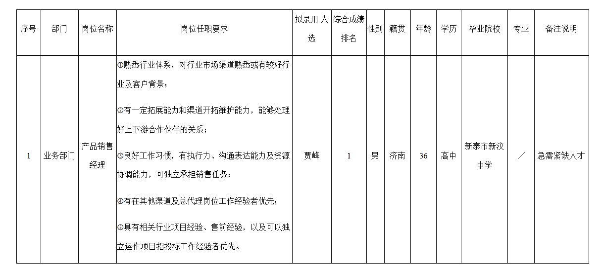 根據(jù)四川長虹佳華信息產品有限責任公司發(fā)布的招聘公告及招聘相關規(guī)定,經(jīng)面試、考察、體檢等程序,擬錄用賈峰同志到四川長虹佳華信息產品有限責任公司工作,現(xiàn)予以公示,具體情況如下: