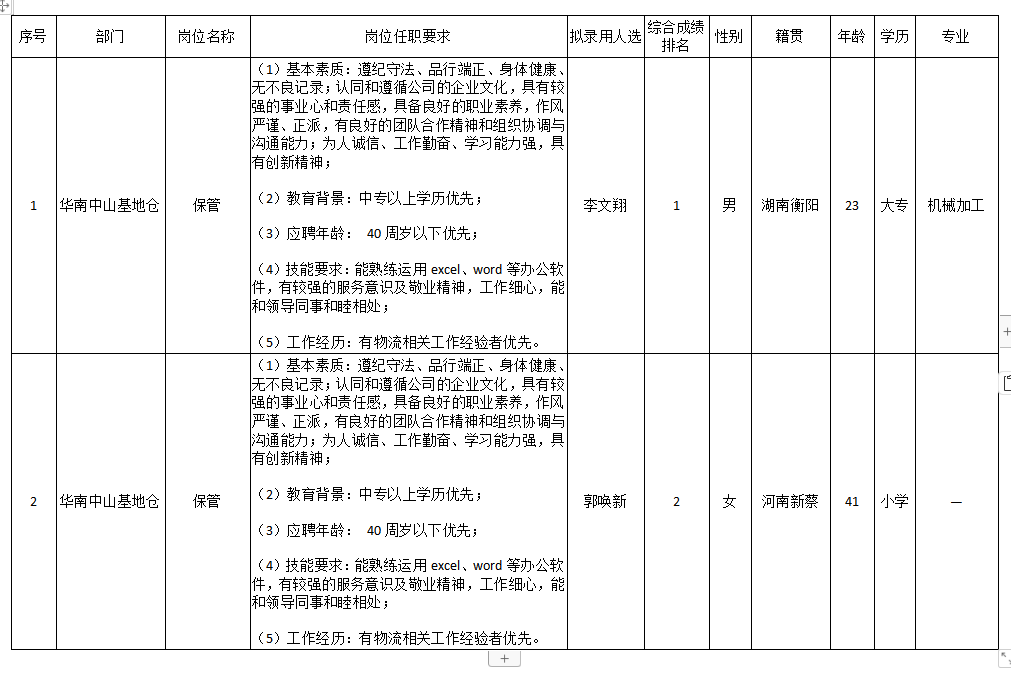 根據(jù)四川長虹民生物流股份有限公司發(fā)布的招聘公告及招聘相關(guān)規(guī)定,經(jīng)面試、體檢等程序,擬錄用李文翔等2名同志到四川長虹民生物流股份有限公司工作,現(xiàn)予以公示,具體情況如下:
