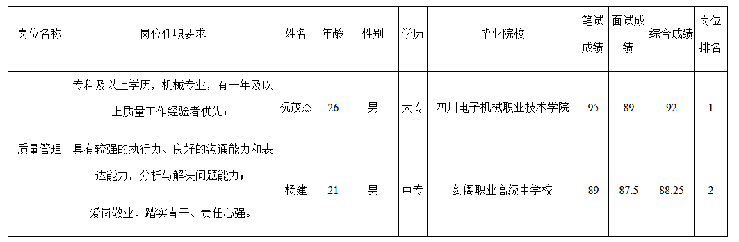 根據(jù)四川長虹技佳精工有限公司發(fā)布的招聘公告及招聘相關(guān)規(guī)定,經(jīng)資格審查、面試等程序,現(xiàn)將測試合格人員予以公示。