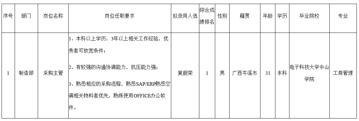 根據(jù)中山長虹電器有限公司發(fā)布的招聘公告及招聘相關規(guī)定,經(jīng)面試、考察、體檢等程序,擬錄用莫超榮同志到采購主管崗位工作,現(xiàn)予以公示,具體情況如下: