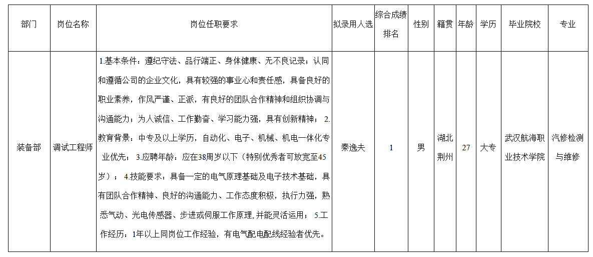 根據(jù)深圳九州光電子技術(shù)有限公司發(fā)布的招聘公告及招聘相關(guān)規(guī)定,經(jīng)筆試、面試、考察、體檢等程序,擬錄用秦逸夫同志到深圳九州光電子技術(shù)有限公司工作,現(xiàn)予以公示,具體情況如下: