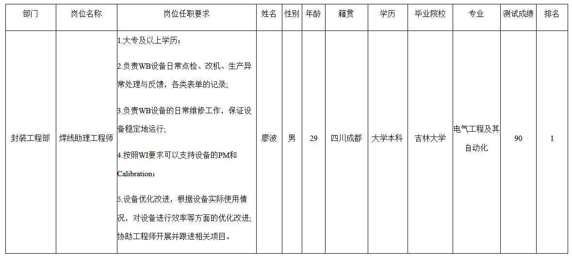 根據(jù)四川啟賽微電子有限公司發(fā)布的招聘公告及招聘相關(guān)規(guī)定,經(jīng)用人單位面試程序,現(xiàn)將測試合格人員予以公示。