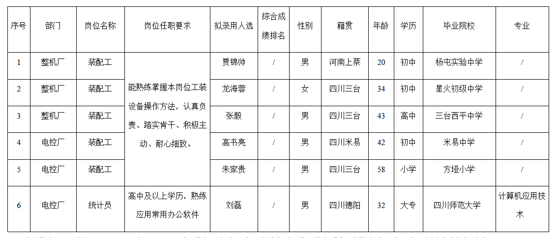根據(jù)四川長虹空調有限公司發(fā)布的招聘公告及招聘相關規(guī)定,經面試、考察、體檢等程序,現(xiàn)對擬錄用人員予以公示,具體情況如下: