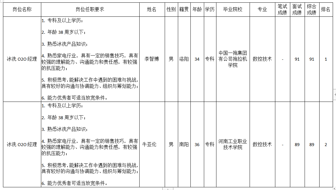根據(jù)四川智易家網(wǎng)絡科技有限公司(長虹·美菱中國區(qū))發(fā)布的招聘公告及招聘相關(guān)規(guī)定,經(jīng)初試、復試等程序,現(xiàn)將面試成績予以公示。