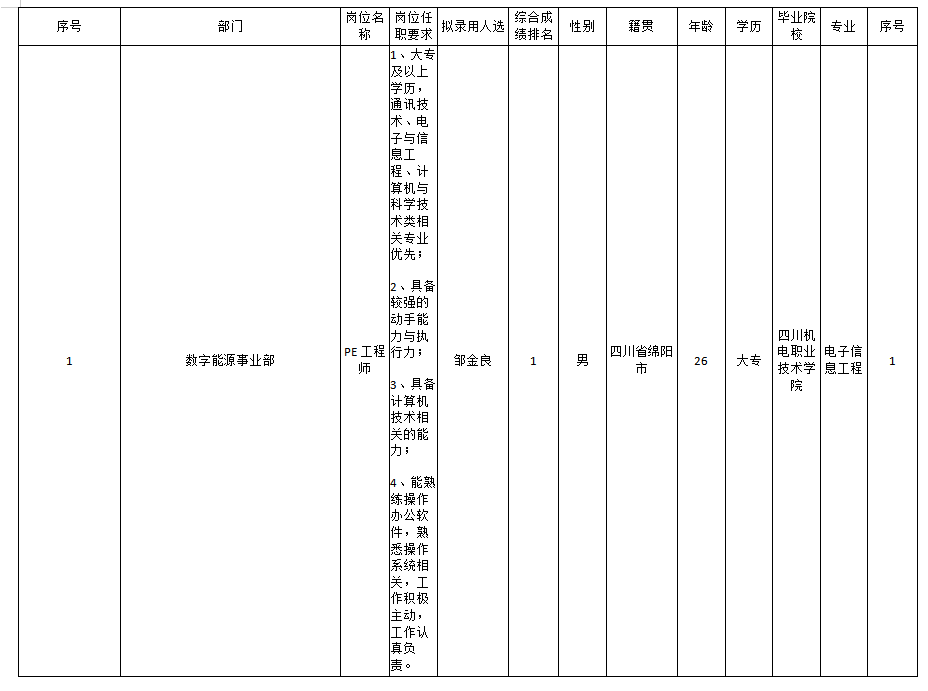 根據(jù)四川九州電子科技股份有限公司發(fā)布的招聘公告及招聘相關(guān)規(guī)定,經(jīng)筆試、面試、考察、體檢等程序,擬錄用鄒金良等4名同志到四川九州電子科技股份有限公司工作,現(xiàn)予以公示,具體情況如下: