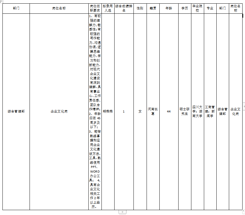 根據(jù)四川九州空管科技有限責任公司發(fā)布的招聘公告及招聘相關(guān)規(guī)定,經(jīng)筆試、面試、考察、體檢等程序,擬錄用胡燕燕,范利瓊同志到四川九州空管科技有限責任公司工作,現(xiàn)予以公示,具體情況如下: