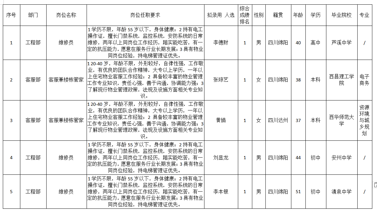 根據(jù)四川長虹物業(yè)服務有限責任公司綿陽分公司發(fā)布的招聘公告及招聘相關規(guī)定,經筆試、面試、考察、體檢等程序,擬錄用李德財、張瓊藝、黃娟、劉顯龍、李本銀到安州世紀城、金嶺1號管理處工作?,F(xiàn)予以公示,具體情況如下: