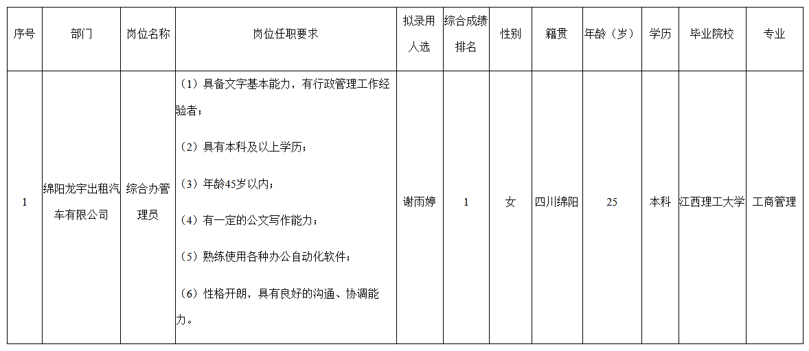 根據(jù)客運集團發(fā)布的招聘公告及招聘相關(guān)規(guī)定,經(jīng)筆試、面試、考察、體檢等程序,擬錄用謝雨婷同志到綿陽龍宇出租汽車有限公司工作,現(xiàn)予以公示,具體情況如下: