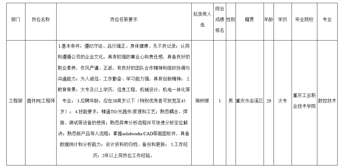 根據(jù)深圳九州光電子技術(shù)有限公司發(fā)布的招聘公告及招聘相關(guān)規(guī)定,經(jīng)筆試、面試、考察、體檢等程序,擬錄用陶樹(shù)銀同志到深圳九州光電子技術(shù)有限公司工作,現(xiàn)予以公示,具體情況如下: