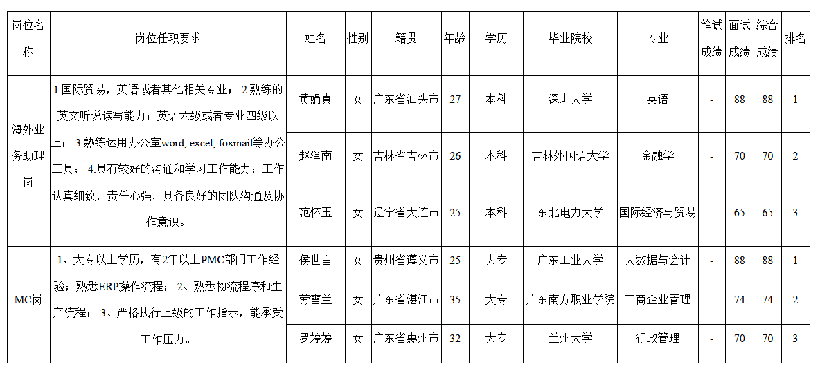 根據(jù)深圳市九州智和科技有限公司發(fā)布的招聘公告及招聘相關(guān)規(guī)定,經(jīng)筆試、面試等程序,現(xiàn)將筆試(面試)成績予以公示。
