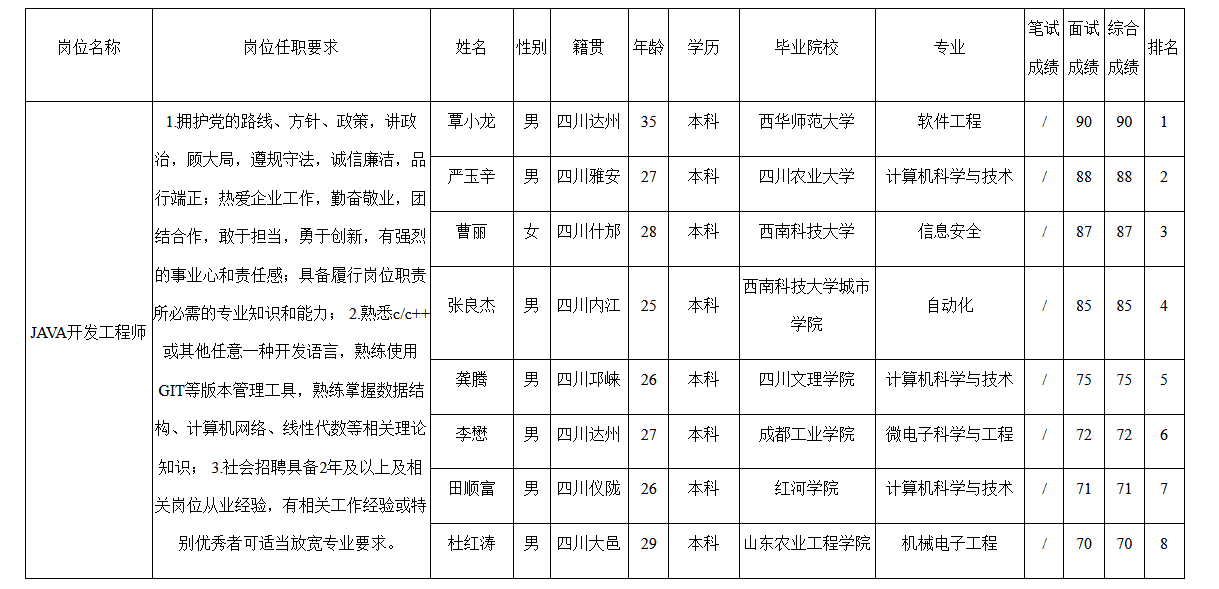 根據(jù)四川九強(qiáng)通信科技有限公司發(fā)布的招聘公告及招聘相關(guān)規(guī)定,經(jīng)筆試、面試等程序,現(xiàn)將筆試(面試)成績(jī)予以公示。
