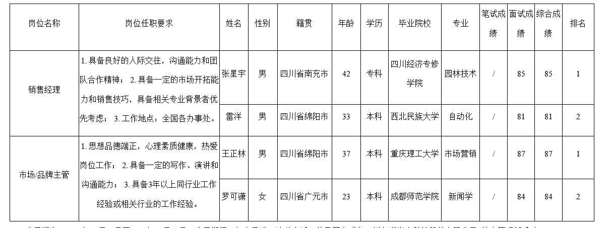 根據(jù)四川九州光電科技股份有限公司發(fā)布的招聘公告及招聘相關(guān)規(guī)定,經(jīng)筆試、面試等程序,現(xiàn)將筆試(面試)成績予以公示。