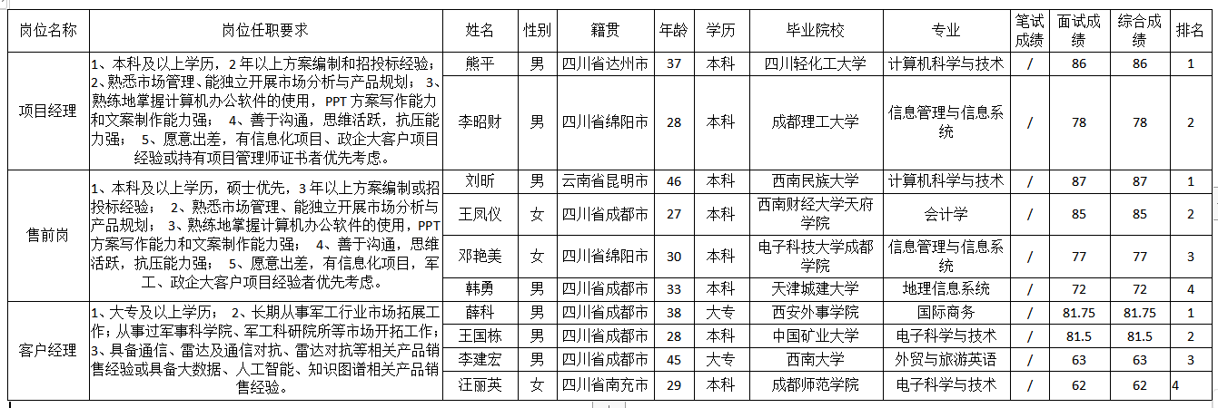 根據(jù)四川九州軟件有限公司發(fā)布的招聘公告及招聘相關規(guī)定,經(jīng)筆試、面試等程序,現(xiàn)將筆試(面試)成績予以公示。