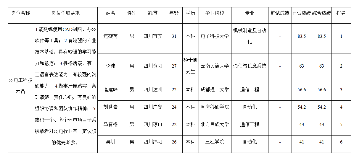根據(jù)四川九州視訊科技有限責任公司發(fā)布的招聘公告及招聘相關規(guī)定,經(jīng)筆試、面試等程序,現(xiàn)將筆試(面試)成績予以公示。