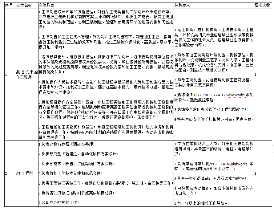 備注:數(shù)控機床操作工程師面向公司內(nèi)外部招聘,AT工程師面向公司外部招聘。