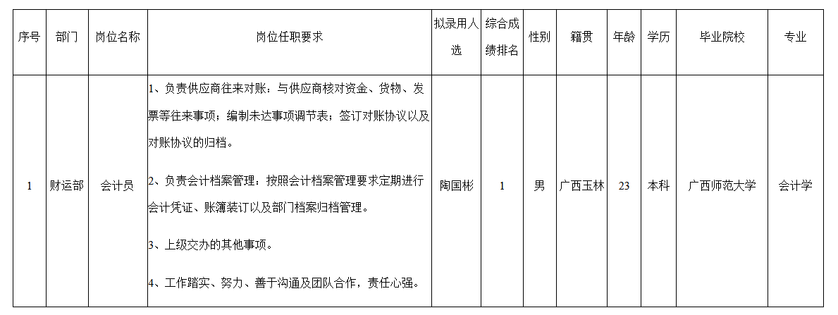 根據(jù)宏源地能熱泵科技(中山)有限公司發(fā)布的招聘公告及招聘相關(guān)規(guī)定,經(jīng)筆試、面試、考察、體檢等程序,擬錄用陶國彬同志到財運(yùn)部-會計崗位工作,現(xiàn)予以公示,具體情況如下: