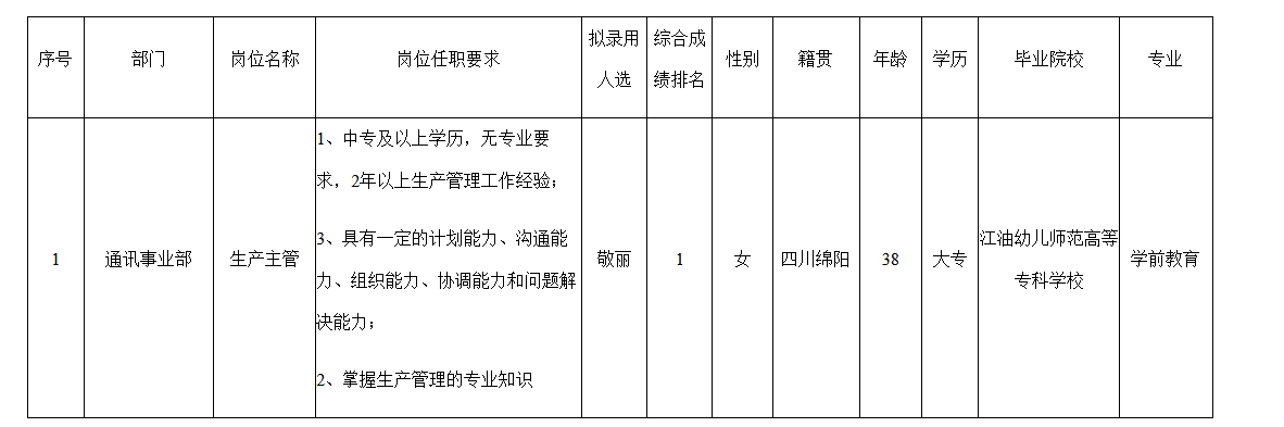 根據(jù)四川華豐科技股份公司發(fā)布的招聘公告及招聘相關(guān)規(guī)定,經(jīng)筆試、面試、考察、體檢等程序,擬錄用敬麗同志到四川華豐科技股份有限公司工作,現(xiàn)予以公示,具體情況如下: