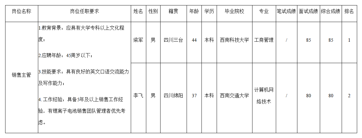 根據(jù)四川長虹杰創(chuàng)鋰電科技有限公司發(fā)布的招聘公告及招聘相關(guān)規(guī)定,經(jīng)面試程序,現(xiàn)將面試成績予以公示。