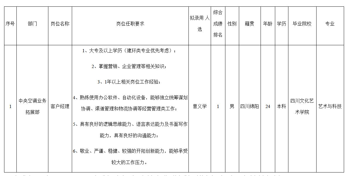 根據(jù)四川長虹空調(diào)有限公司發(fā)布的招聘公告及招聘相關(guān)規(guī)定,經(jīng)面試、體檢等程序,擬錄用曾義學(xué)到長虹空調(diào)工作,現(xiàn)予以公示,具體情況如下: