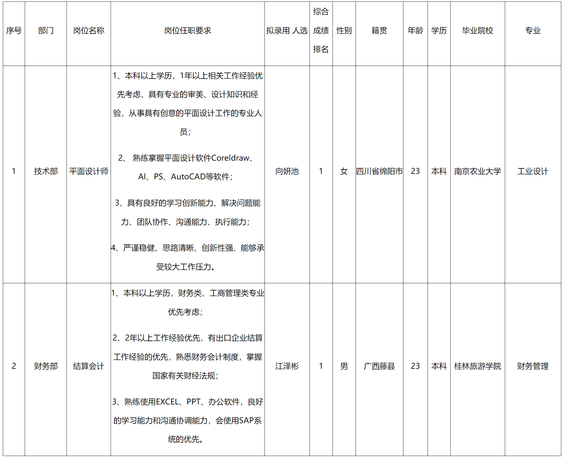 根據(jù)中山長虹電器有限公司發(fā)布的招聘公告及招聘相關(guān)規(guī)定,經(jīng)面試、考察、體檢等程序,擬錄用向妍池同志到平面設(shè)計(jì)師、江澤彬同志到結(jié)算會(huì)計(jì)崗位工作,現(xiàn)予以公示,具體情況如下: