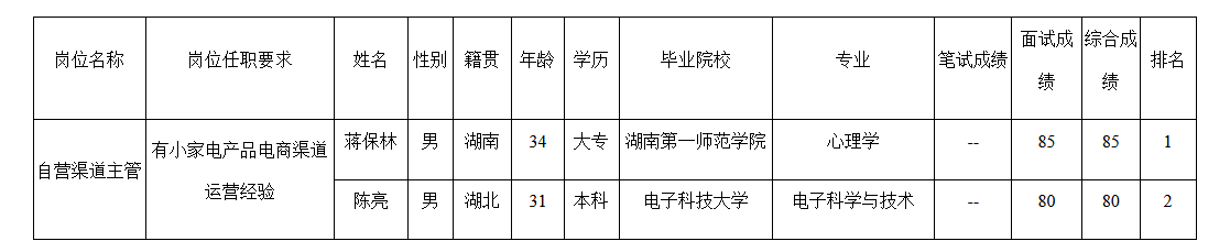 根據(jù)長虹美菱日電科技有限公司發(fā)布的招聘公告及招聘相關(guān)規(guī)定,經(jīng)面試程序,現(xiàn)將面試成績予以公示。