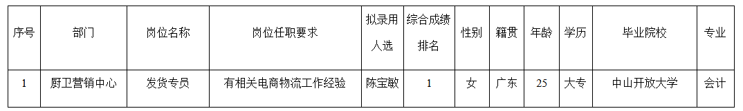 根據(jù)長虹美菱日電科技有限公司發(fā)布的招聘公告及招聘相關(guān)規(guī)定,經(jīng)面試、體檢等程序,擬錄用陳寶敏同志到長虹美菱日電科技有限公司工作,現(xiàn)予以公示,具體情況如下: