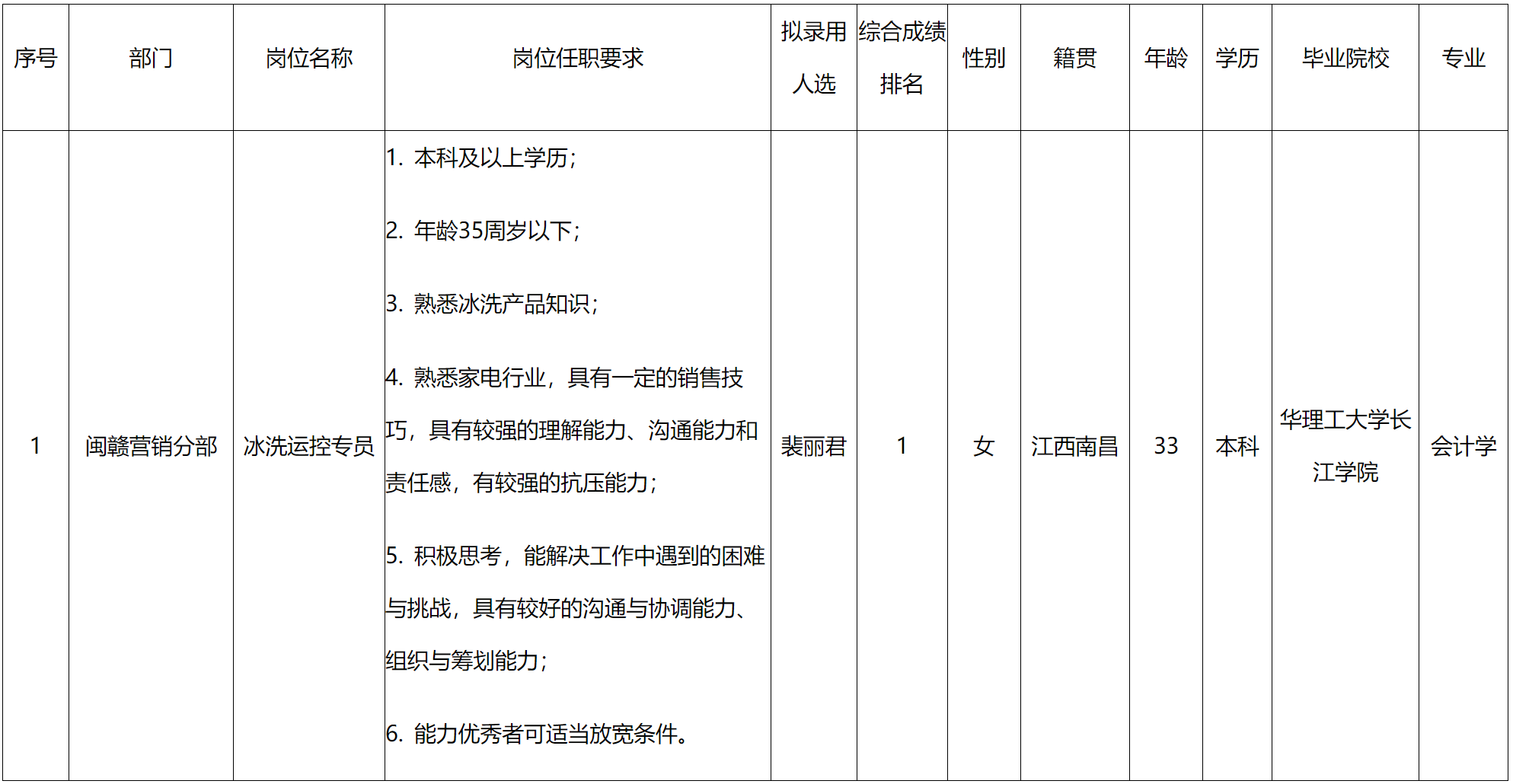 根據(jù)四川智易家網(wǎng)絡(luò)科技有限公司(長虹·美菱中國區(qū))發(fā)布的招聘公告及招聘相關(guān)規(guī)定,經(jīng)面試、考察、體檢等程序,擬錄用裴麗君同志到閩贛營銷分部工作,現(xiàn)予以公示,具體情況如下: