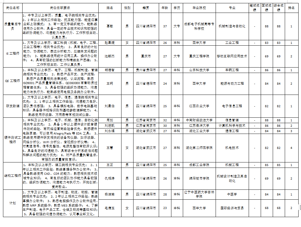 根據(jù)四川九州電子科技股份有限公司發(fā)布的招聘公告及招聘相關(guān)規(guī)定,經(jīng)筆試、面試等程序,現(xiàn)將筆試(面試)成績予以公示。