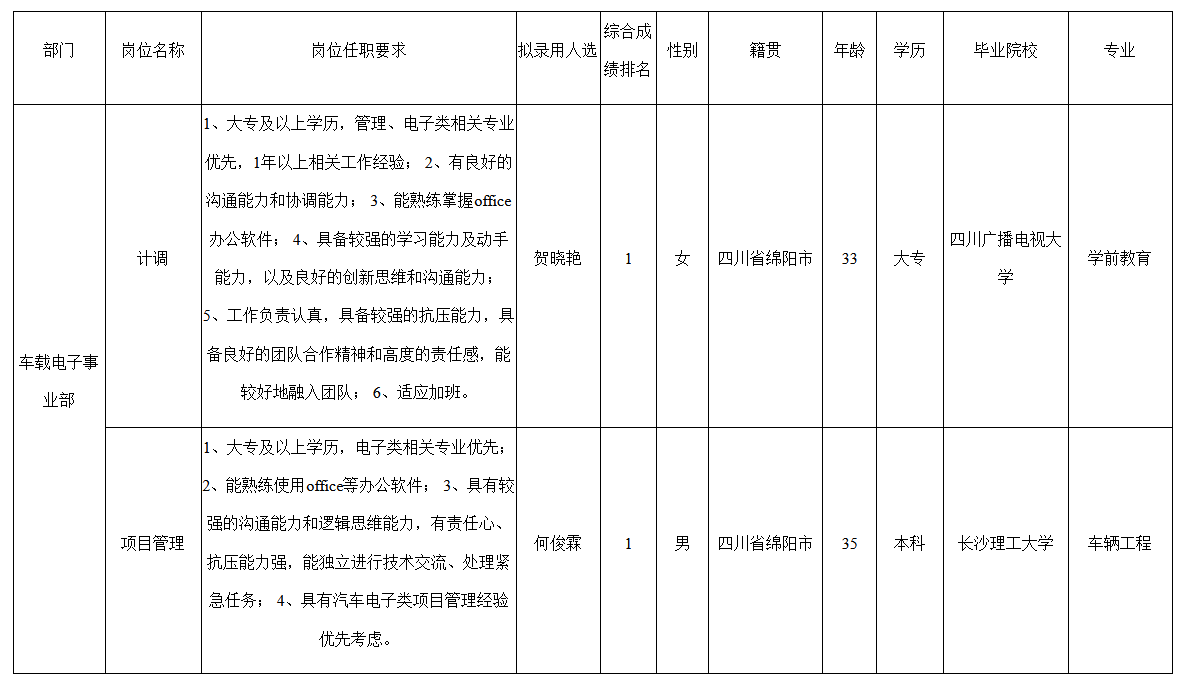 根據(jù)四川九州電子科技股份有限公司發(fā)布的招聘公告及招聘相關(guān)規(guī)定,經(jīng)筆試、面試、考察、體檢等程序,擬錄用賀曉艷,何俊霖同志到四川九州電子科技股份有限公司工作,現(xiàn)予以公示,具體情況如下: