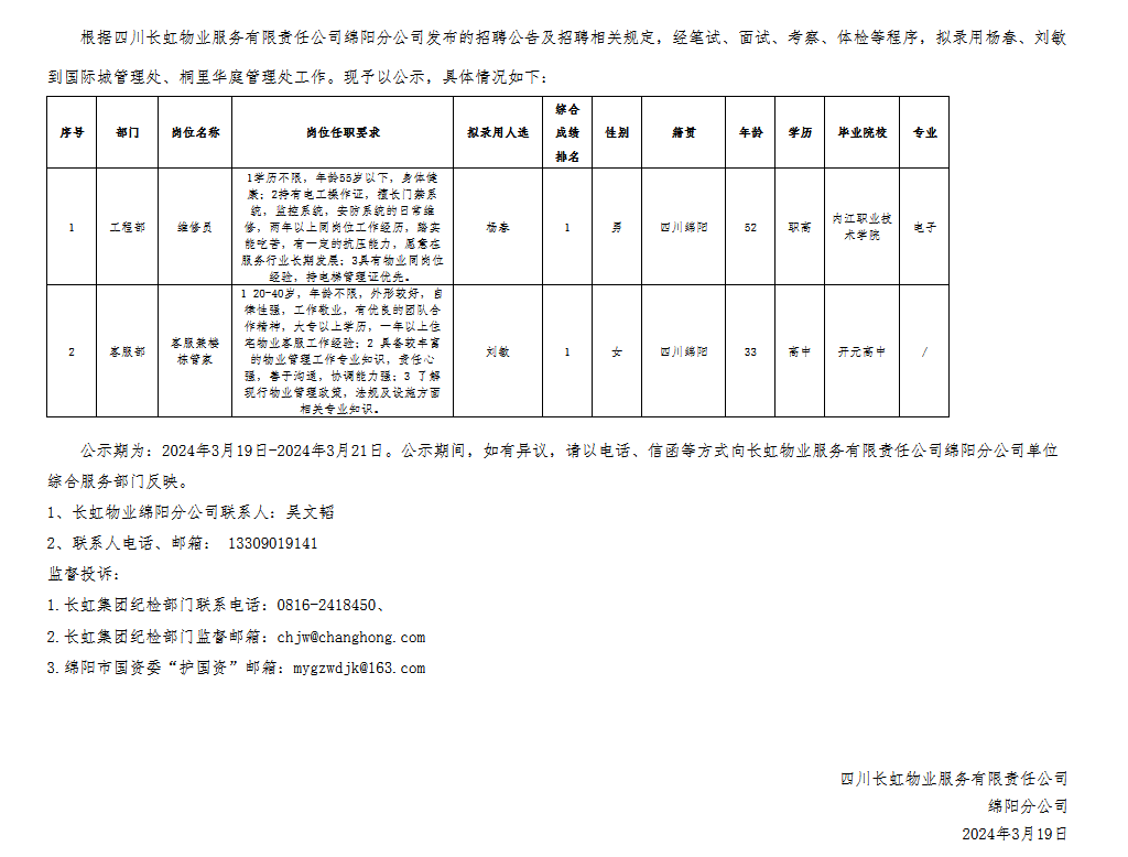 四川長虹物業(yè)服務(wù)有限責(zé)任公司綿陽分公司關(guān)于招聘維修員等崗位擬錄用人員的公示
