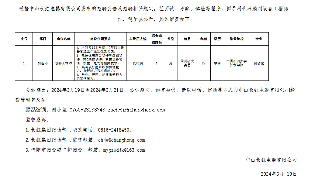 中山長虹電器有限公司關(guān)于招聘設(shè)備工程師擬錄用人員的公示