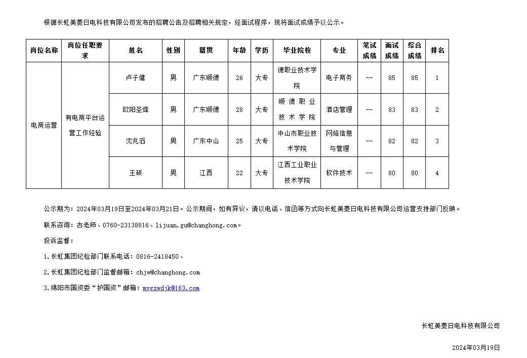 長虹美菱日電科技有限公司關(guān)于招聘電商運(yùn)營崗成績的公示