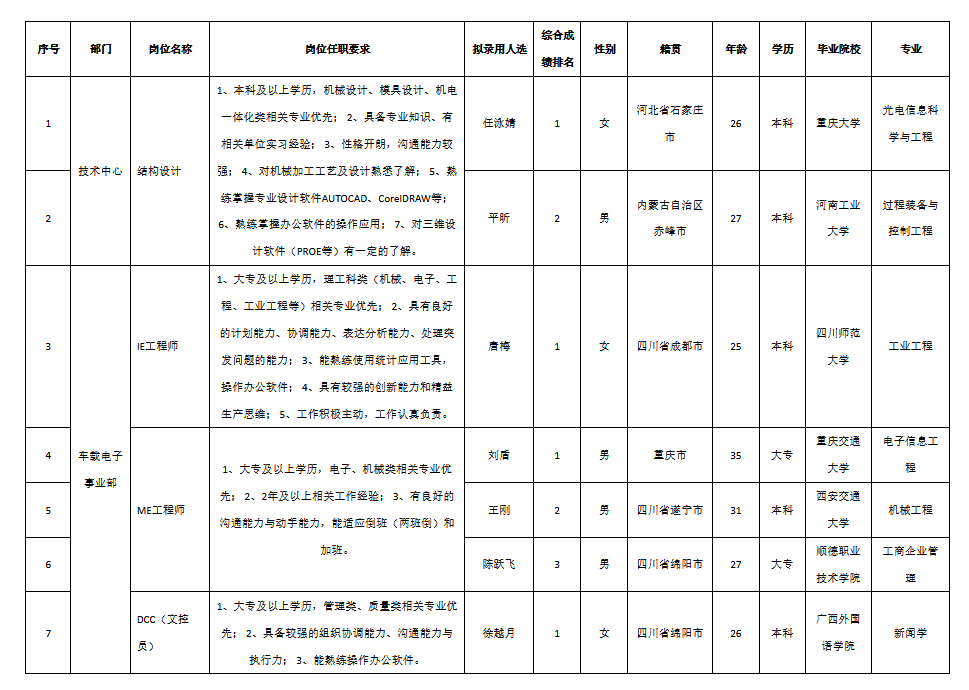根據四川九州電子科技股份有限公司發(fā)布的招聘公告及招聘相關規(guī)定,經筆試、面試、考察、體檢等程序,擬錄用任泳婧,平昕,劉盾,王剛,陳躍飛,唐梅,徐越月同志到四川九州電子科技股份有限公司工作,現予以公示,具體情況如下: