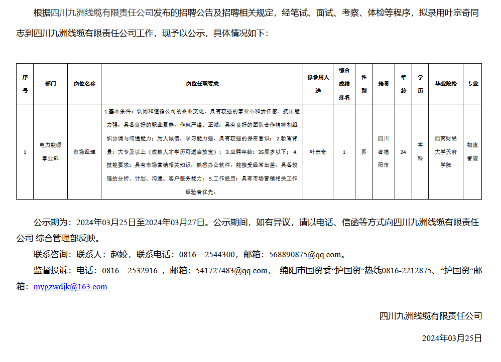 四川九洲線纜有限責(zé)任公司關(guān)于招聘市場經(jīng)理擬錄用人員的公示