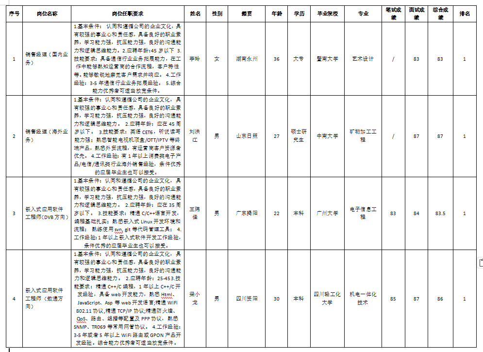 根據(jù)深圳市九州電器有限公司發(fā)布的招聘公告及招聘相關(guān)規(guī)定,經(jīng)筆試、面試等程序,現(xiàn)將筆試(面試)成績(jī)予以公示。