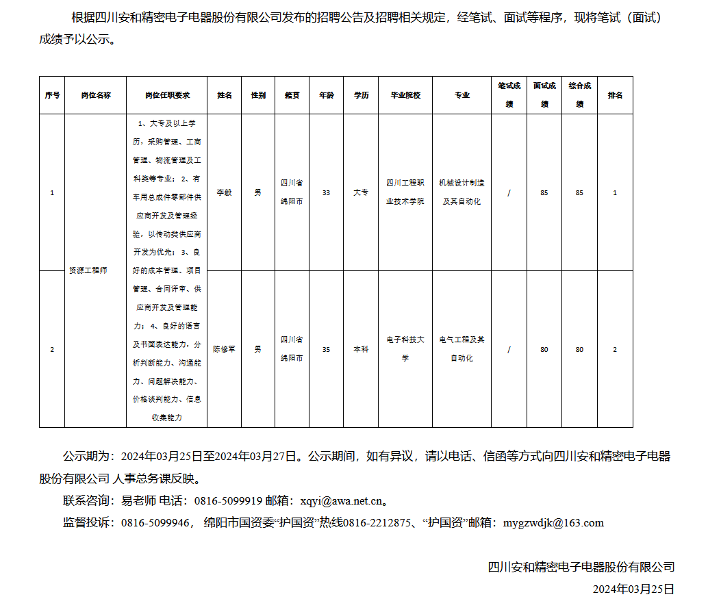 四川安和精密電子電器股份有限公司關(guān)于招聘資源管理工程師成績(jī)的公示