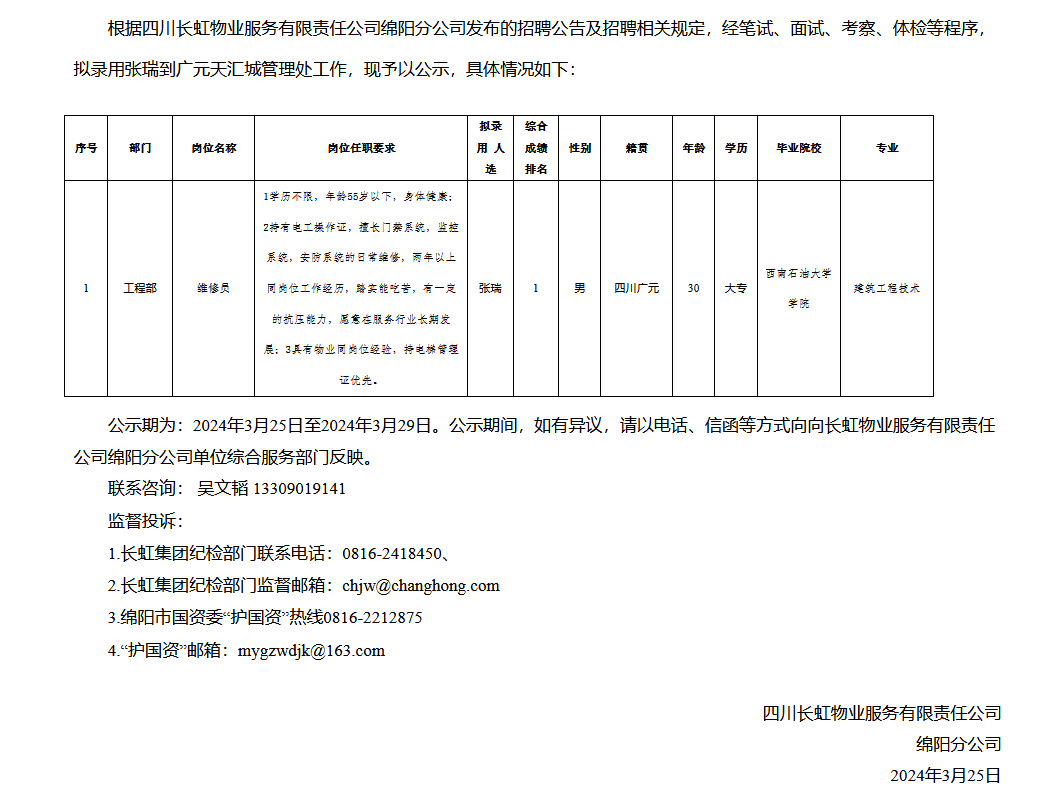 四川長(zhǎng)虹物業(yè)服務(wù)有限責(zé)任公司綿陽分公司關(guān)于招聘維修員擬錄用人員的公示