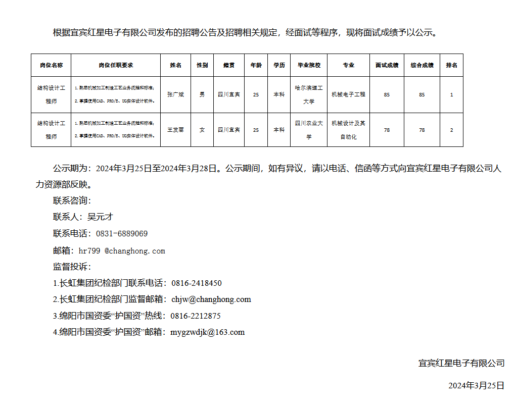 宜賓紅星電子有限公司關(guān)于招聘結(jié)構(gòu)設(shè)計(jì)工程師成績的公示