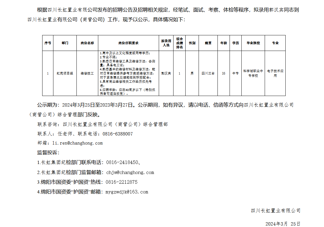 四川長(zhǎng)虹置業(yè)有限公司關(guān)于關(guān)于招聘維修技工(操作職)擬錄用人員的公示