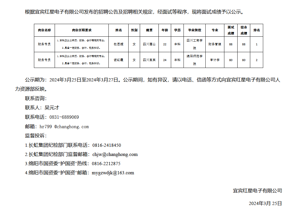 宜賓紅星電子有限公司關于招聘財務專員成績的公示